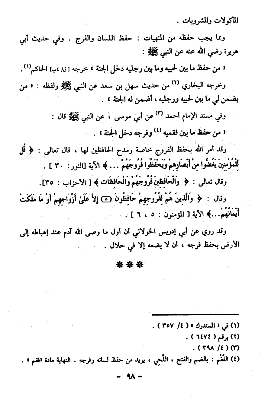 ومما يجب حفظه من المنهيات: حفظ اللسان والفرج. وفي حديث أبي هريرة رضي الله عنه عن النبي صلّى الله عليه وسلم: