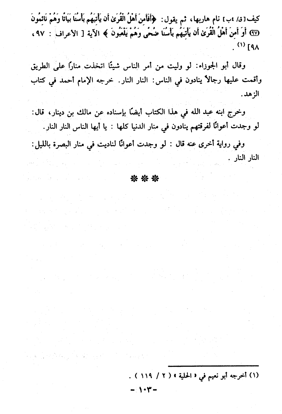 وخرَّج ابنُه عبدُ اللَّه في هذا الكتابِ أيضًا بإسنادِهِ عن مالكِ بنِ دينارٍ، قالَ: لو وجدتُ أعوانًا لفرقتهم ينادون في منارِ الدنيا كلها: يا أيها الناس النارَ النارَ.