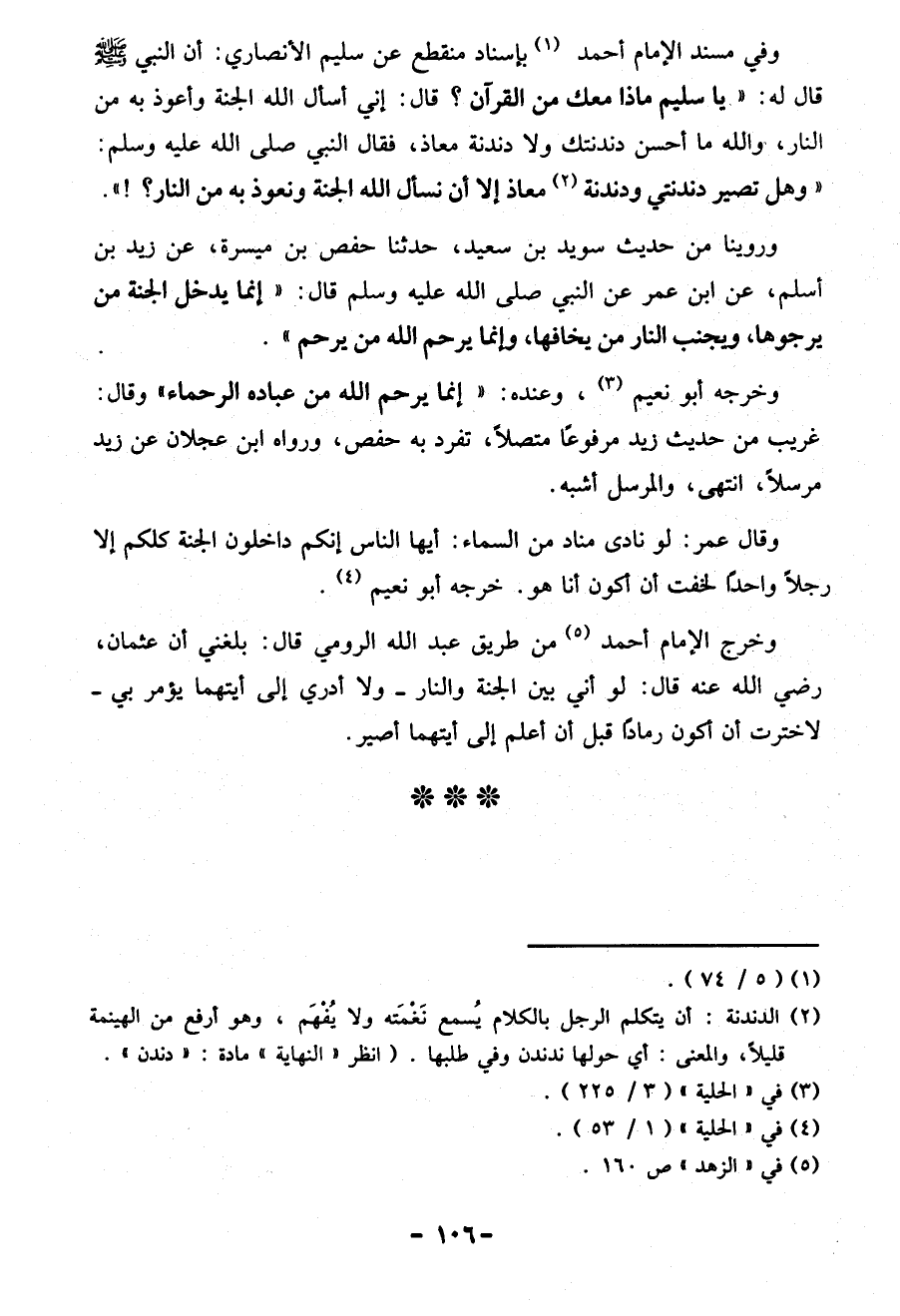 وفي مسند الإمام أحمد (¬1) بإسناد منقطع عن سليم الأنصاري: أن النبي صلّى الله عليه وسلم قال له: "يَا سُلَيْمُ مَاذَا مَعَكَ مِنَ الْقُرْآنِ؟ قَالَ: إِنِّي أَسْأَلُ اللهَ الْجَنَّةَ وَأَعُوذُ بِهِ مِنَ النَّارِ، وَاللهِ مَا أُحْسِنُ دَنْدَنَتَكَ وَلَا دَنْدَنَةَ مُعَاذٍ، فَقَالَ النَّبِيُّ اللهِ صَلَّى اللهُ عَلَيْهِ وَسَلَّمَ: "وَهَلْ تَصِيرُ دَنْدَنَتِي وَدَنْدَنَةُ (¬2) مُعَاذٍ إِلَّا أَنْ نَسْأَلَ اللهَ الْجَنَّةَ وَنَعُوذَ بِهِ مِنَ النَّارِ؟! ".