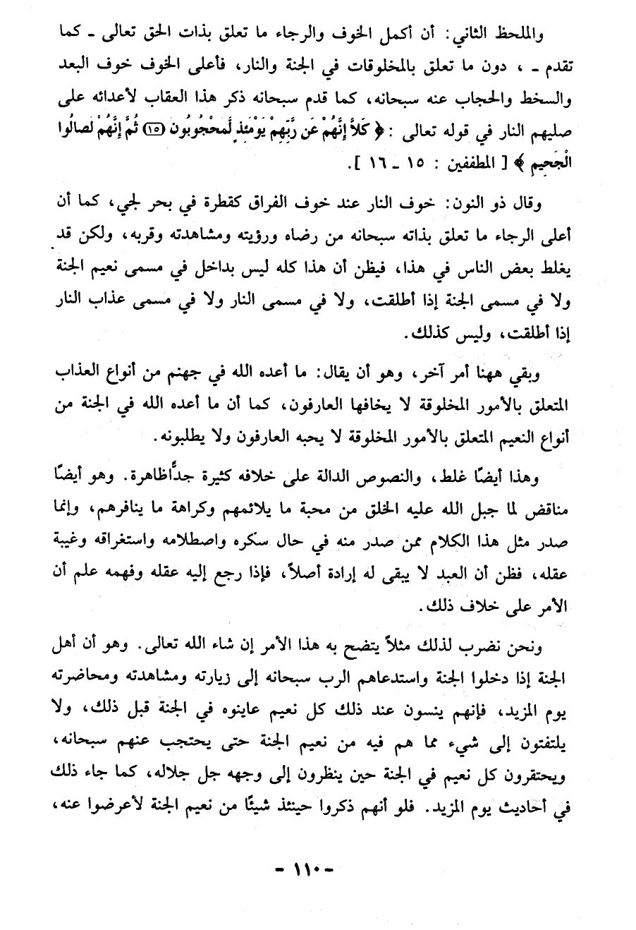 والملحظ الثاني: أن أكمل الخوف والرجاء ما تعلق بذات الحق تعالى -كما تقدم-، دون ما تعلق بالمخلوقات في الجنة والنار، فأعلى الخوف خوف البعد والسخط والحجاب عنه سبحانه، كما قدم سبحانه ذكر هذا العقاب لأعدائه عَلَى صليهم النار في قوله تعالى: {كَلَّا إِنَّهُمْ عَنْ رَبِّهِمْ يَوْمَئِذٍ لَمَحْجُوبُونَ (15) ثُمَّ إِنَّهُمْ لَصَالُو الْجَحِيمِ} [المطففين: 15، 16].
