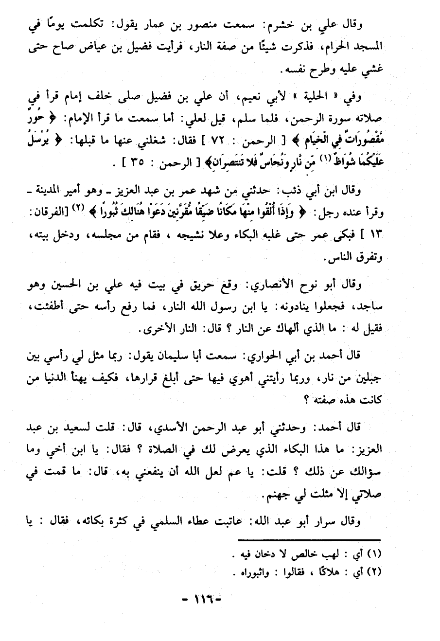 وفي "الحلية" لأبي نعيم، أن علي بن فضيل صلّى خلف إمام قرأ في صلاته سورة الرحمن، فلما سلم، قيل لعلي: أما سمعت ما قرأ الإمام: {حُورٌ مَقْصُورَاتٌ فِي الْخِيَامِ} [الرحمن: 72] فَقَالَ: شغلني عنها ما قبلها: {يُرْسَلُ عَلَيْكُمَا شُوَاظٌ (¬1) مِنْ نَارٍ وَنُحَاسٌ فَلَا تَنْتَصِرَانِ} [الرحمن: 35].
