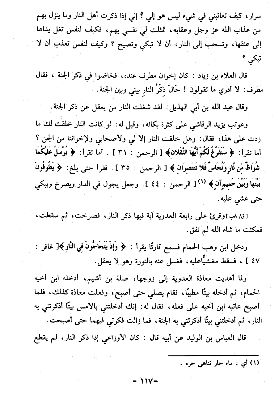 سرار، كيف تعاتبني في شيء ليس هو إلي؟ إني إذا ذكرت أهل النار وما ينزل بهم من عذاب الله عز وجل وعقابه، تمثلت لي نفسي بهم، فكيف لنفس تغل يداها إِلَى عنقها، وتسحب إِلَى النار، أن لا تبكي وتصيح؟ وكيف لنفس تعذب أن لا تبكي؟