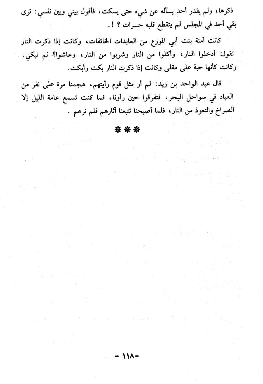 قال عبد الواحد بن زيد: لم أر مثل قوم رأيتهم، هجمنا مرة عَلَى نفر من العباد في سواحل البحر، فتفرقوا حين رأونا، فما كنت تسمع عامة الليل إلا الصراخ والتعوذ من النار، فلما أصبحنا تتبعنا آثارهم فلم نرهم.