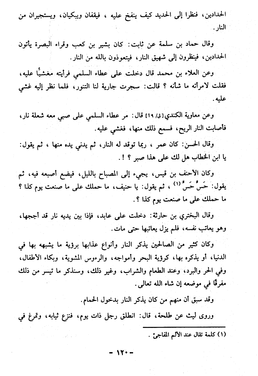 وقال حماد بن سلمة عن ثابت: كان بشير بن كعب وقراء البصرة يأتون الحدادين، فينظرون إِلَى شهيق النار، فيتعوذون بالله من النار.