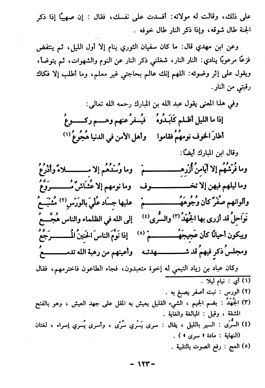 وعن ابن مهدي قَالَ: ما كان سفيان الثوري ينام إلاَّ أول الليل، ثم ينتفض فزعًا مرعوبًا ينادي: النار النار، شغلني ذكر النار عن النوم والشهوات، ثم يتوضأ، ويقول عَلَى إثر وضوئه: اللهم إنك عالم بحاجتي غير معلم، وما أطلب إلاَّ فكاك رقبتي من النار.