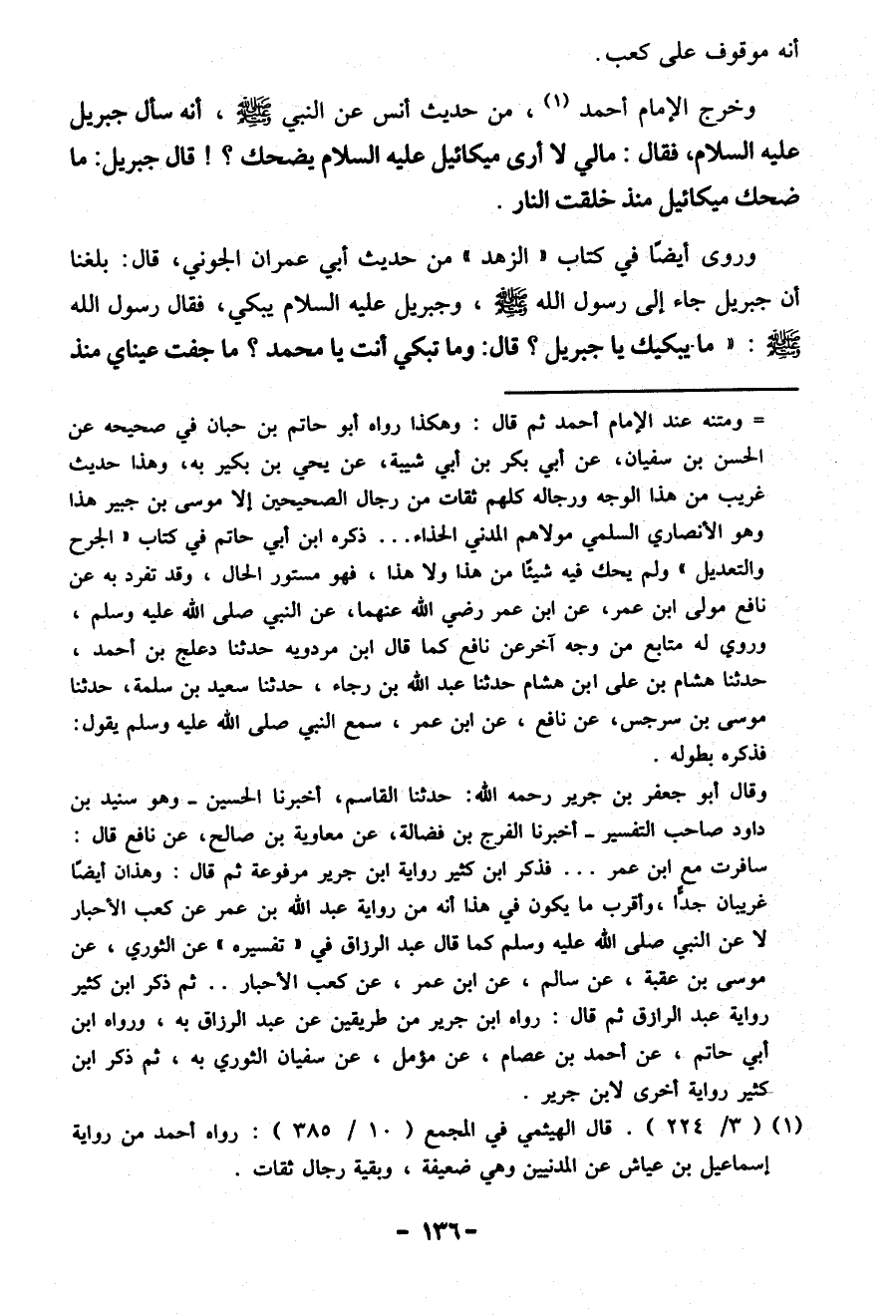 وروى أيضاً في كتاب "الزهد" من حديث أبي عمران الجوني، قَالَ: بلغنا أن جبريل جاء إِلَى رسول الله صلّى الله عليه وسلم، وجبريل عليه السلام يبكي، فَقَالَ رسول الله - صلى الله عليه وسلم -: "ما يبكيك يا جبريل؟ قَالَ: وما تبكي أنت يا محمد؟ ما جفت عيناي منذ