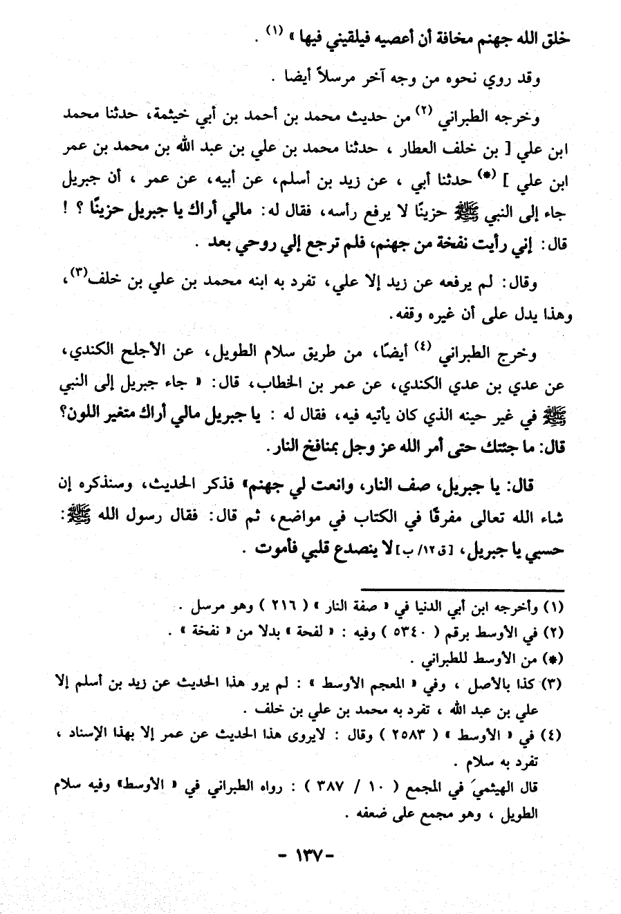 وخرّجه الطبراني (¬2) من حديث محمد بن أحمد بن أبي خيثمة، حدثنا محمد ابن علي [بن خلف العطار، حدثنا محمد بن علي بن عبد الله بن محمد بن عمر ابن علي] (*) حدثنا أبي، عن زيد بن أسلم، عن أبيه، عن عمر، وإن جبريل جاء إِلَى النبيّ صلّى الله عليه وسلم حزينًا لا يرفع رأسه، فَقَالَ له: مالي أراك يا جبريل حزينًا؟! قَالَ: إني رأيت نفخة من جهنم، فلم ترجع إلي روحي بعد.