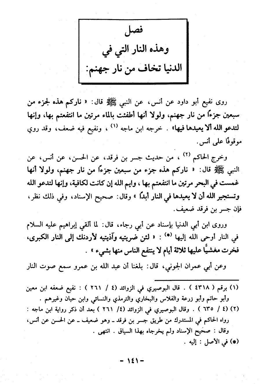 روى نفيع أبو داود عن أنس، عن النبيّ صلّى الله عليه وسلم قال: "ناركم هذه لجزء من سبعين جزءًا من نار جهنم، ولولا أنها أطفئت بالماء مرتين ما انتفعتم بها، وإنها لتدعو الله ألا يعيدها فيها". خرّجه ابن ماجه (¬1)، ونفيع فيه ضعف، وقد رُوي موقوفًا عَلَى أنس.