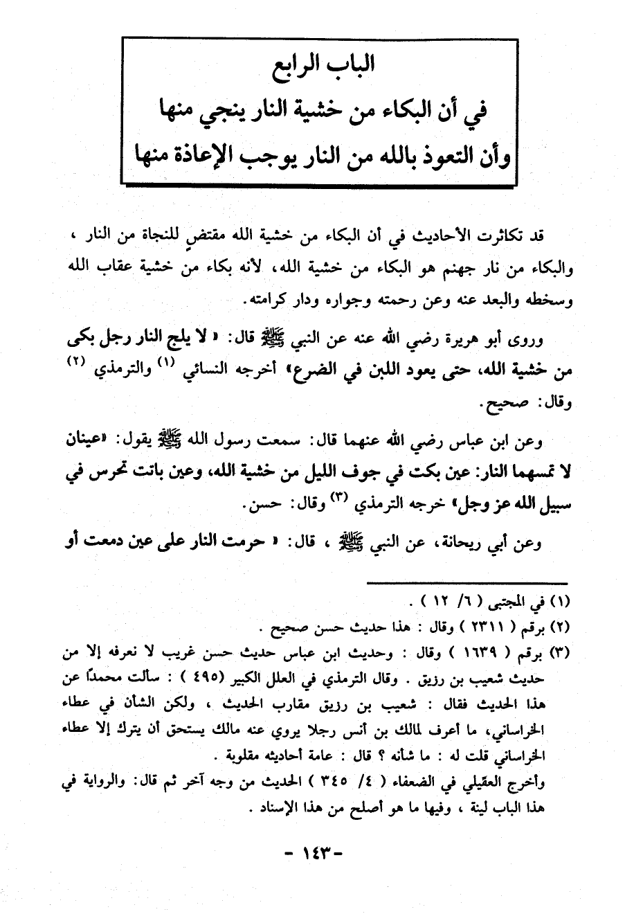 الباب الرابع في أن البكاء من خشية النار ينجي منها وأن التعوذ بالله من النار يوجب الإعاذة منها