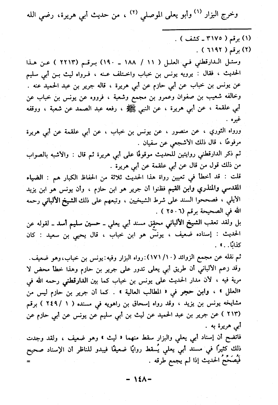 وقد زعم الألباني أن طريق أبي يعلى تدور عَلَى جرير بن حازم وهذا خطأ محض لا مرية فيه، لأنّ مدار الحديث عَلَى يونس بن خباب كما بين الدارقطني رحمه الله في "العلل"، وابن حجر في "المطالب العالية". كما أن جرير بن حازم ليس من مشايخه يونس بن يزيد، وقد رواه إسحاق بن راهويه في مسنده (1/ 249) برقم (213) عن جرير بن عبد الحميد عن ليث بن أبي سليم عن يونس عن أبي حازم عن أبي هريرة به.