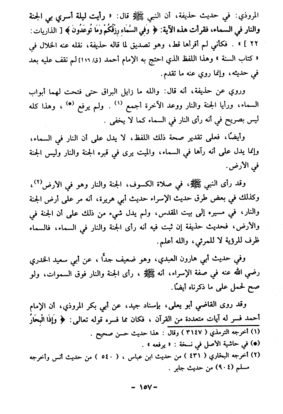 المروذي: في حديث حذيفة، أن النبيّ صلّى الله عليه وسلم قَالَ: "رأيت ليلة أسري بي الجنة والنار في السماء، فقرأت هذه الآية: {وَفِي السَّمَاءِ رِزْقُكُمْ وَمَا تُوعَدُونَ} [الذاريات: 22]. فكأني لم أقرأها قط، وهو تصديق لما قاله حذيفة، نقله عنه الخلال في "كتاب السنة" وهذا اللفظ الَّذِي احتج به الإمام أحمد لم نقف عليه بعد في حديثه، وإنَّما رُوي عنه ما تقدّم.