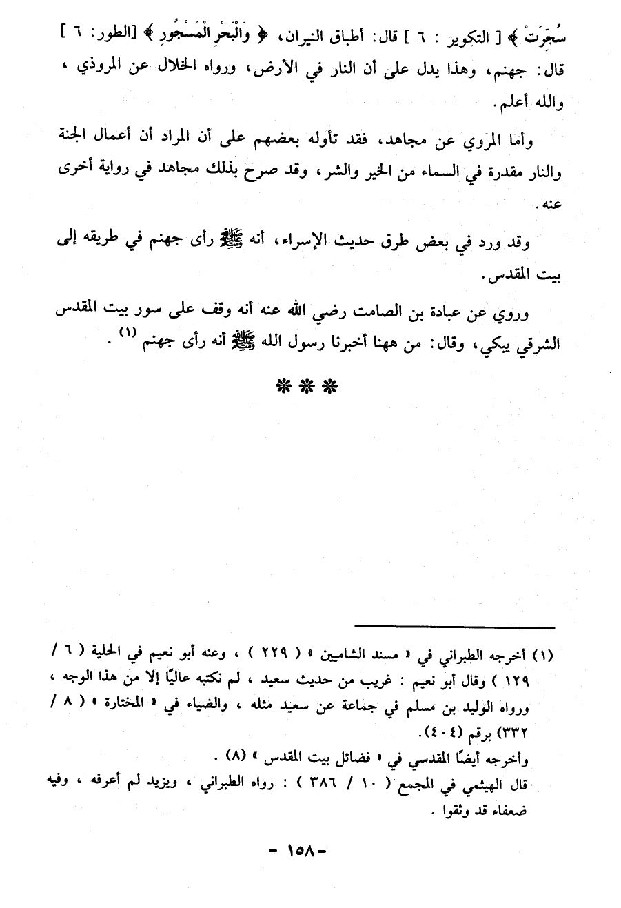 ورُوي عن عبادة بن الصامت رضي الله عنه أنّه وقف عَلَى سور بيت المقدس الشرقي يبكي، وقال: من هاهنا أخبرنا رسول الله صلّى الله عليه وسلم أنّه رأى جهنم (¬1).