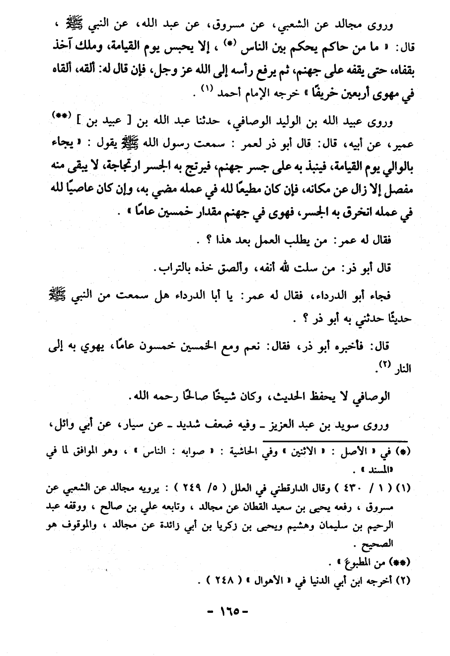 وروى عبيد الله بن الوليد الوصافي، حدثنا عبد الله بن [عبيد بن] (**) عمير، عن أبيه، قَالَ: قَالَ أبو ذر لعمر: سمعت رسول الله صلّى الله عليه وسلم يقول: "يجاء بالوالي يوم القيامة، فينبذ به عَلَى جسر جهنم، فيرتج به الجسر ارتجاجة، لا يبقى منه مفصل إلاَّ زال عن مكانه، فإن كان مطيعًا لله في عمله مضي به، وإن كان عاصيًا لله في عمله انخرق به الجسر، فهوى في جهنم مقدار خمسين عامًا".