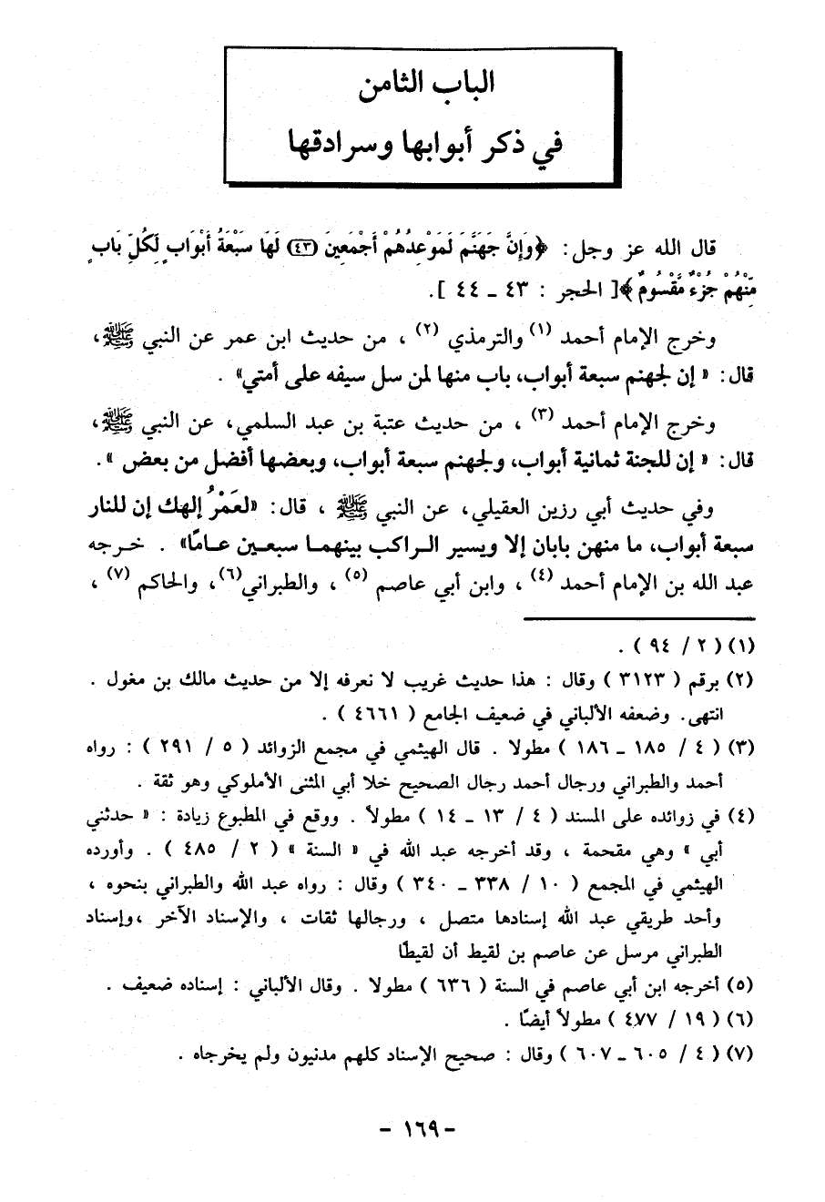 وخرج الإمام أحمد (¬3)، من حديث عتبة بن عبد السلمي، عن النبيّ صلّى الله عليه وسلم، قال: "إن للجنة ثمانية أبواب، ولجهنم سبعة أبواب، وبعضها أفضل من بعض".