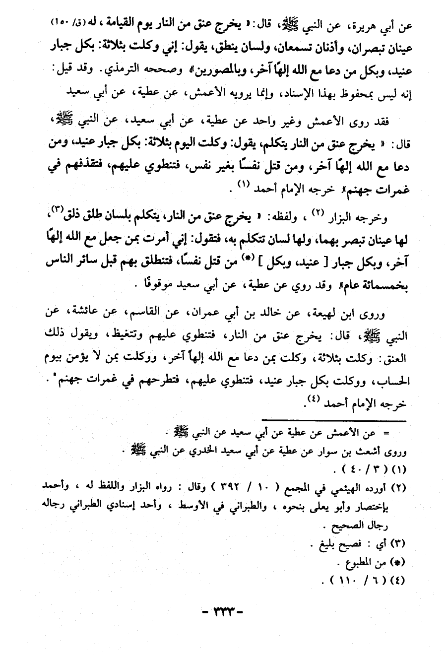 فقد روى الأعمش وغير واحد عن عطية، عن أبي سعيد، عن النبيّ صلّى الله عليه وسلم، قَالَ: "يخرج عنق من النار يتكلم، يقول: وكلت اليوم بثلاثة: بكل جبار عنيد، ومن دعا مع الله إلهًا آخر، ومن قتل نفسًا بغير نفس، فتنطوي عليهم، فتقذفهم في غمرات جهنم". خرّجه الإمام أحمد (¬1).