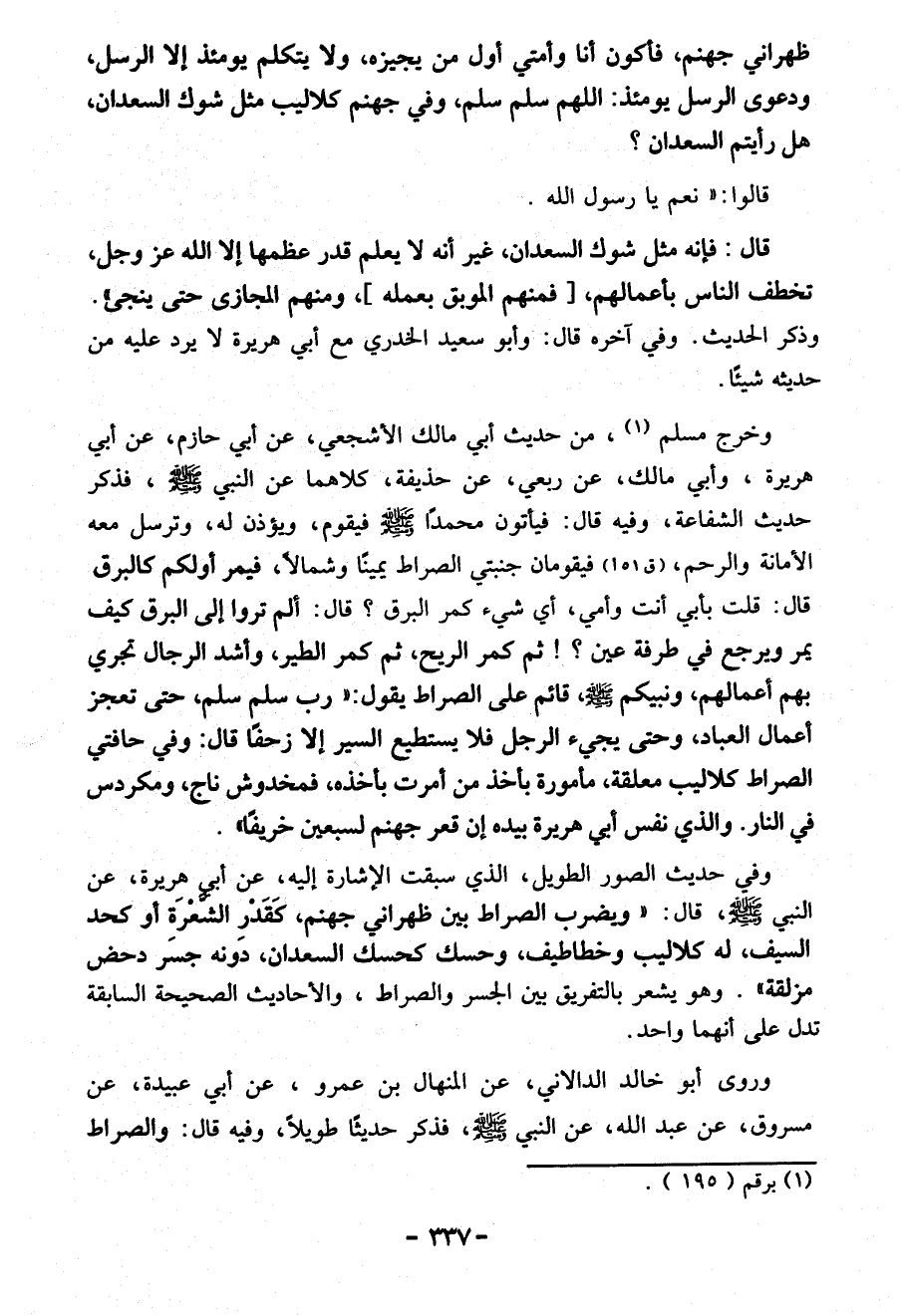 ظهراني جهنم، فأكون أنا وأمتي أول من يجيزه، ولا يتكلم يومئذ إلاَّ الرسل، ودعوى الرسل يومئذ: اللهم سلم سلم، وفي جهنم كلاليب مثل شوك السعدان، هل رأيتم السعدان؟