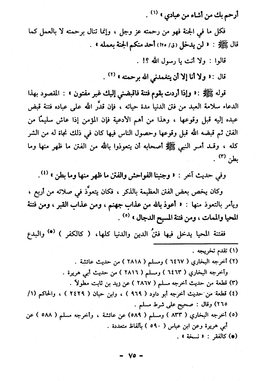 قوله - صلى الله عليه وسلم -: "وإذا أردت بقوم فتنة فاقبضني إليك غير مفتون": المقصود بهذا الدعاء سلامة العبد من فتن الدُّنْيَا مدة حياته، فإن قُدِّر الله عَلَى عباده فتنة قبض عبده إِلَيْهِ قبل وقوعها، وهذا من أم الأدعية فإن المؤمن إذا عاش سليمًا من الفتن ثم قبضه الله قبل وقوعها وحصول الناس فيها كان في ذلك نجاة له من الشر كله، وقد أمر النبي صلّى الله عليه وسلم أصحابه أن يتعوذوا بالله من الفتن ما ظهر منها وما بطن (¬3).