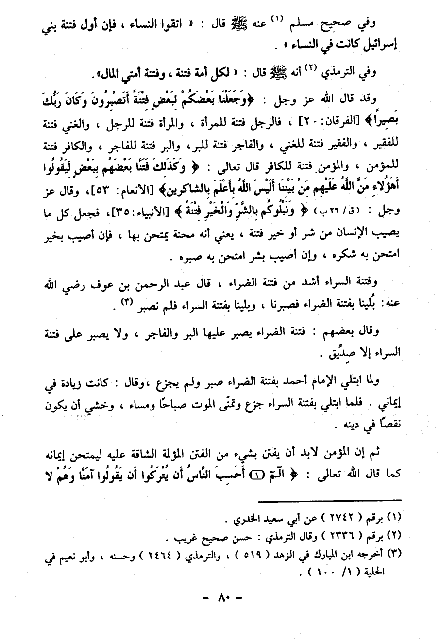 وقد قال الله عز وجل: {وَجَعَلْنَا بَعْضَكُمْ لِبَعْضٍ فِتْنَةً أَتَصْبِرُونَ وَكَانَ رَبُّكَ بَصِيرًا} [الفرقان: 20]، فالرجل فتنة للمرأة، والمرأة فتنة للرجل، والغني فتنة للفقير، والفقير فتنة للغني، والفاجر فتنة للبر، والبر فتنة للفاجر، والكافر فتنة للمؤمن، والمؤمن فتنة للكافر قال تعالى: {وَكَذَلِكَ فَتَنَّا بَعْضَهُمْ بِبَعْضٍ لِيَقُولُوا أَهَؤُلَاءِ مَنَّ اللَّهُ عَلَيْهِمْ مِنْ بَيْنِنَا أَلَيْسَ اللَّهُ بِأَعْلَمَ بِالشَّاكِرِينَ} [الأنعام: 53]، وقال عز وجل: {وَنَبْلُوكُمْ بِالشَّرِّ وَالْخَيْرِ فِتْنَةً} [الأنبياء: 35]، فجعل كل ما يصيب الإنسان من شر أو خير فتنة، يعني أنَّه محنة يمتحن بها، فإن أصيب بخير امتحن به شكره، وإن أصيب بشر امتحن به صبره.