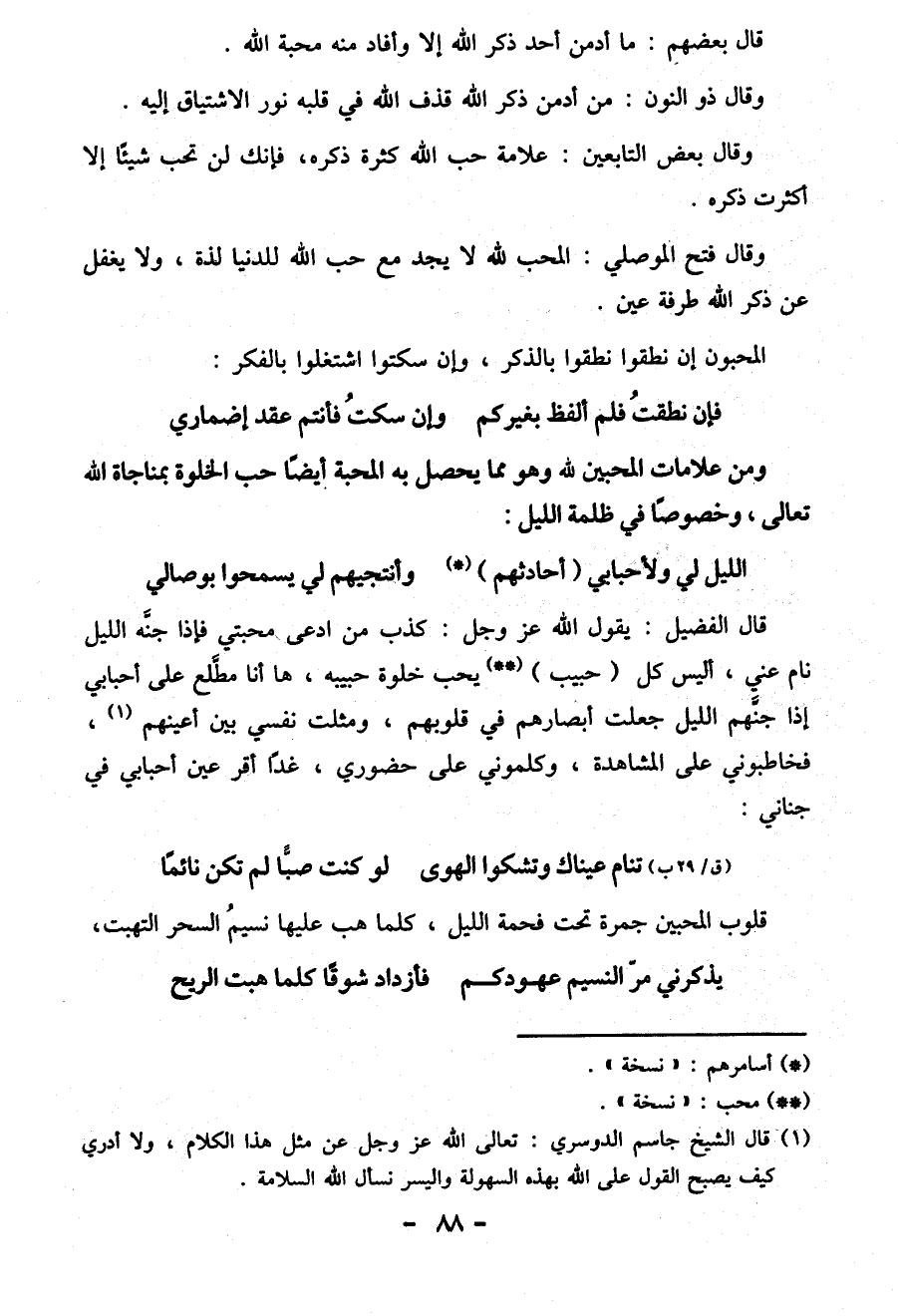 ومن علامات المحبين لله وهو مما يحصل به المحبة أيضاً حب الخلوة بمناجاة الله تعالى، وخصوصًا في ظلمة الليل: