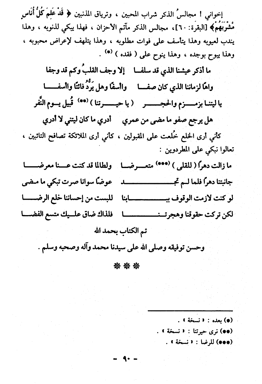 إخواني! مجالسُ الذكر شراب المحبين، وترياق المذنبين {قَدْ عَلِمَ كُلُّ أُنَاسٍ مَشْرَبَهُمْ} [البقرة: 60]، مجالس الذكر مآتم الأحزان، فهذا يبكي لذنوبه، وهذا يندب لعيوبه وهذا يتأسف عَلَى فوات مطلوبه، وهذا يتلهف لإعراض محبوبه، وهذا ييوح بوجده، وهذا ينوح عَلَى (فقده) (*).
