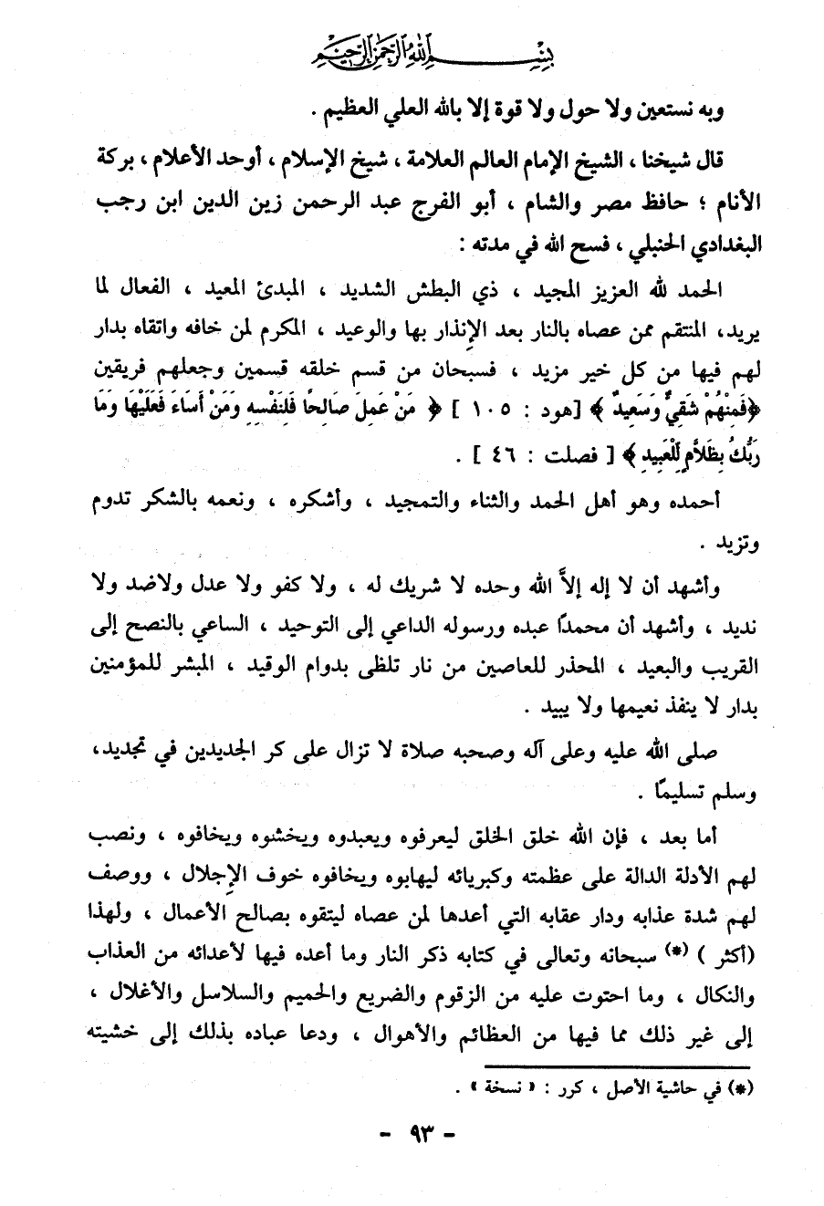 قال شيخنا، الشيخ الإمام العالم العلامة، شيخ الإسلام، أوحد الأعلام، بركة الأنام؛ حافظ مصر والشام، أبو الفرج عبد الرحمن زين الدين ابن رجب البغدادي الحنبلي، فسح الله في مدته:
