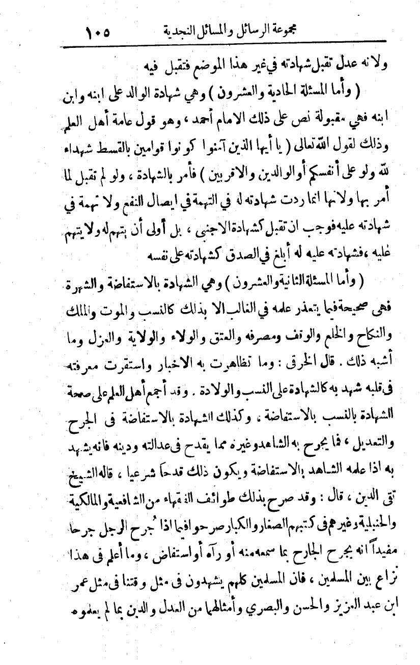 (وأما المسألة الحادية والعشرون) : وهي شهادة الوالد على ابنه وابن ابنه، فهي مقبولة نص على ذلك الإمام أحمد، وهو قول عامة أهل العلم، وذلك لقول الله تعالى: {يَا أَيُّهَا الَّذِينَ آمَنُوا كُونُوا قَوَّامِينَ بِالْقِسْطِ شُهَدَاءَ لِلَّهِ وَلَوْ عَلَى أَنْفُسِكُمْ أَوِ الْوَالِدَيْنِ وَالأَقْرَبِينَ} 1 فأمر بالشهادة، ولو لم تقبل لما أمر بها؛ ولأنها إنما ردت شهادته له في التهمة في إيصال النفع، ولا تهمة في شهادته عليه؛ فوجب أن تقبل كشهادة الأجنبي، بل أولى أن يتهم له، ولا يتهم عليه، فشهادته عليه له أبلغ في الصدق كشهادته على نفسه.