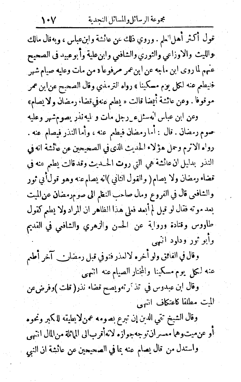 وعن ابن عباس: أنه سئل عن رجل مات، وعليه نذر بصوم شهر، وعليه صوم رمضان. قال: أما رمضان، فيطعم عنه، وأما النذر فيصام عنه. رواه الأثرم، وحمل هؤلاء الحديث الذي في الصحيحين عن عائشة أنه في النذر، بدليل أن عائشة هي التي روت الحديث، وقد قالت: يطعم عنه في قضاء رمضان ولا يصام.