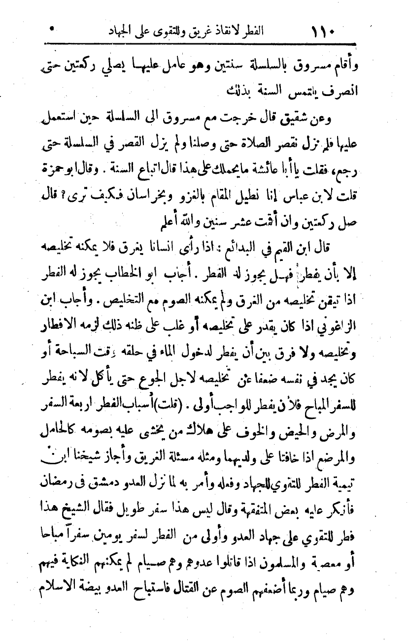 وعن شقيق قال: خرجت مع مسروق إلى السلسلة حين استعمل عليها؛ فلم نزل نقصر الصلاة حتى وصلنا، ولم يزل القصر في السلسلة حتى رجع، فقلت: يا أبا عائشة ما يحملك على هذا؟ قال: اتباع السنة. وقال أبو حمزة: قلت لابن عباس: إنا نطيل المقام بالغزو بخراسان فكيف ترى؟ قال: صلّ ركعتين، وإن أقمت عشر سنين، والله أعلم..