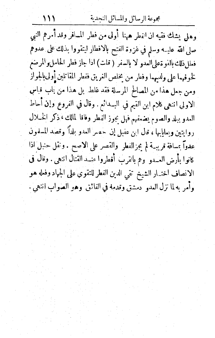 وهل يشك فقيه أن الفطر هاهنا أولى من فطر المسافر؟ وقد أمرهم النبي –صلى الله عليه وسلم- في غزوة الفتح بالإفطار ليتقووا بذلك على عدوهم فعلل ذلك بالقوة على العدو لا بالسفر. قلت: إذا جاز فطر الحامل، والمرضع لخوفهما على ولديهما، وفطر من يخلص الغريق، ففطر المقاتلين أولى بالجواز، ومن جعل هذا من المصالح المرسلة فقد غلط بل هذا من باب قياس الأولى. انتهى كلام ابن القيم في البدائع.