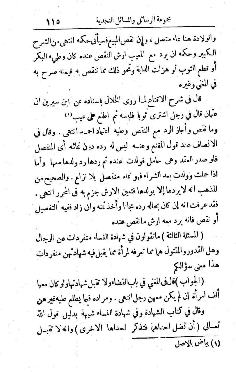 والولادة هنا نماء متصل. وإن نقص المبيع فسيأتي حكمه. انتهى من الشرح الكبير، وحكمه أن يرد مع المعيب أَرْش النقص عنده كأن وطئ البكر، أو قطع الثوب، أو هزلت الدابة، ونحو ذلك مما تنقص به قيمته. صرح به في المغني وغيره. قال في شرح الإقناع: لما روى الخلال بإسناده عن ابن سيرين أن عثمان قال في رجل اشترى ثوبا فلبسه ثم اطلع على عيب:..1 وما نقص، وأجاز الرد مع النقص، وعليه اعتماد أحمد. انتهى. وقال في الإنصاف عند قول المقنع: وعنه ليس له رده دون نمائه: أي: المنفصل، فلو صدر العقد وهي حامل فولدت عنده، ثم ردها رد ولدها معها، وأما إذا حملت وولدت بعد الشراء فهو نماء منفصل بلا نزاع، والصحيح من المذهب أنه لا يردها إلا بولدها فتعين الأرش جزم به في المحرر. انتهى. فقد عرفت أنه إن كان بحاله رده مجانا، وأخذ ثمنه، وإن زاد ففيه التفصيل، أو نقص فإنه يرد معه أرش ما نقص عنده.
