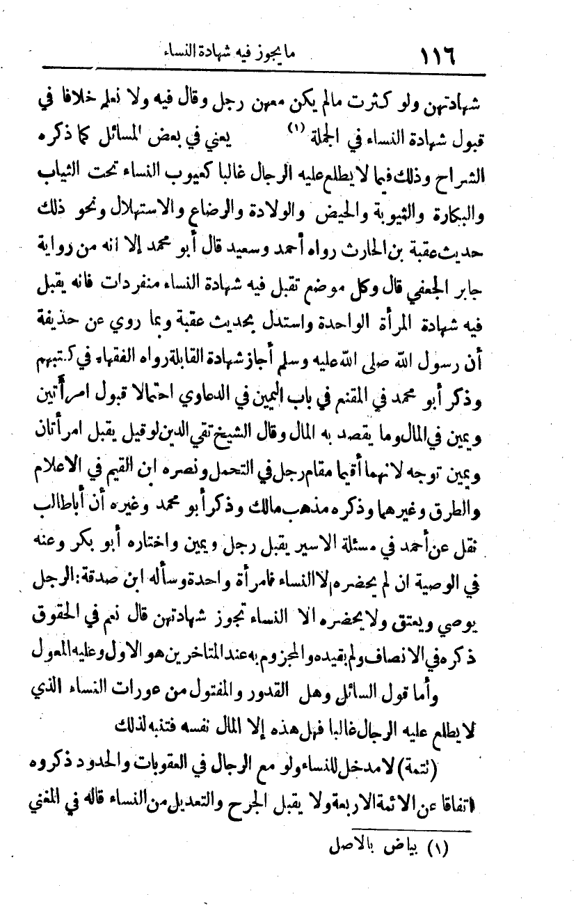 شهادتهن، ولو كثرت ما لم يكن معهن رجل، وقال فيه: ولا نعلم خلافا في قبول شهادة النساء في الجملة ... 1 يعني في بعض المسائل كما ذكره الشرّاح، وذلك فيما لا يطلع عليه الرجال غالبا كعيوب النساء تحت الثياب، والبكارة، والثيوبة، والحيض، والولادة، والرضاع، والاستهلال، ونحو ذلك.