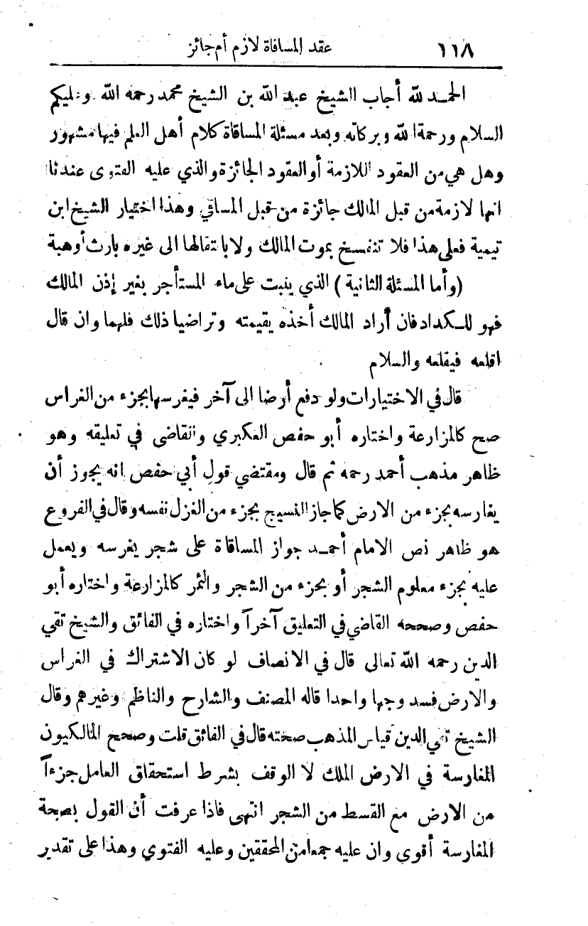 الحمد لله أجاب الشيخ عبد الله بن الشيخ محمد- رحمه الله- وعليكم السلام ورحمة الله وبركاته وبعد: مسألة المساقاة كلام أهل العلم فيها مشهور، وهل هي من العقود اللازمة، أو العقود الجائزة؟ والذي عليه الفتوى عندنا أنها لازمة من قبل المالك جائزة من قبل المساقي، وهذا اختيار الشيخ ابن تيمية؛ فعلى هذا فلا تنفسخ بموت المالك، ولا بانتقالها إلى غيره بإرث أو هبة.