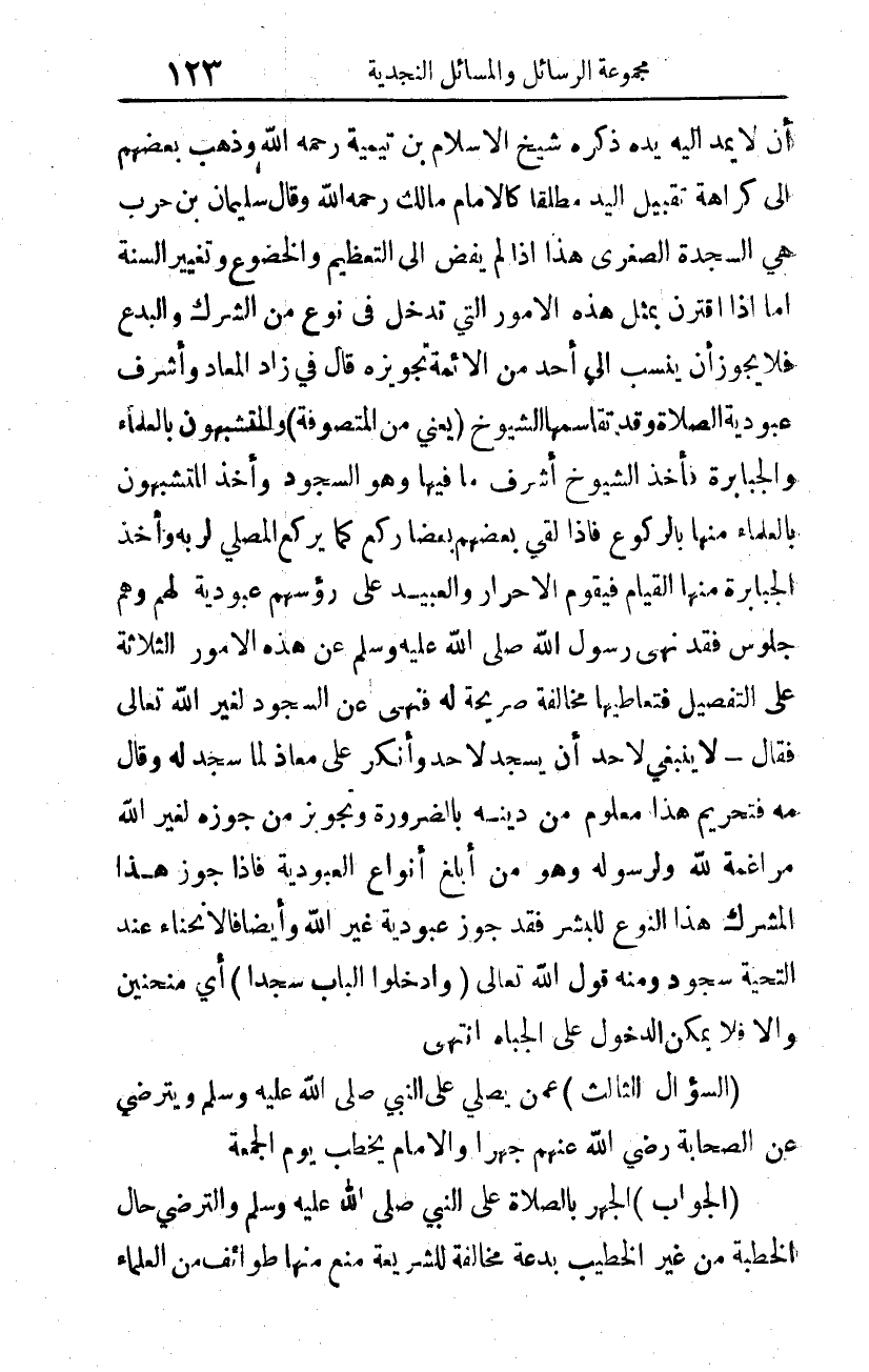 فتحريم هذا معلوم من دينه بالضرورة، وتجويز من جوزه لغير الله مراغمة لله ولرسوله. وهو من أبلغ أنواع العبودية، فإذا جوز هذا المشرك هذا النوع للبشر، فقد جوز عبودية غير الله. وأيضا فالانحناء عند التحية سجود، ومنه قول الله تعالى: {وَادْخُلُوا الْبَابَ سُجَّداً} 1 أي: منحنين، وإلا فلا يمكن الدخول على الجباه. انتهى.