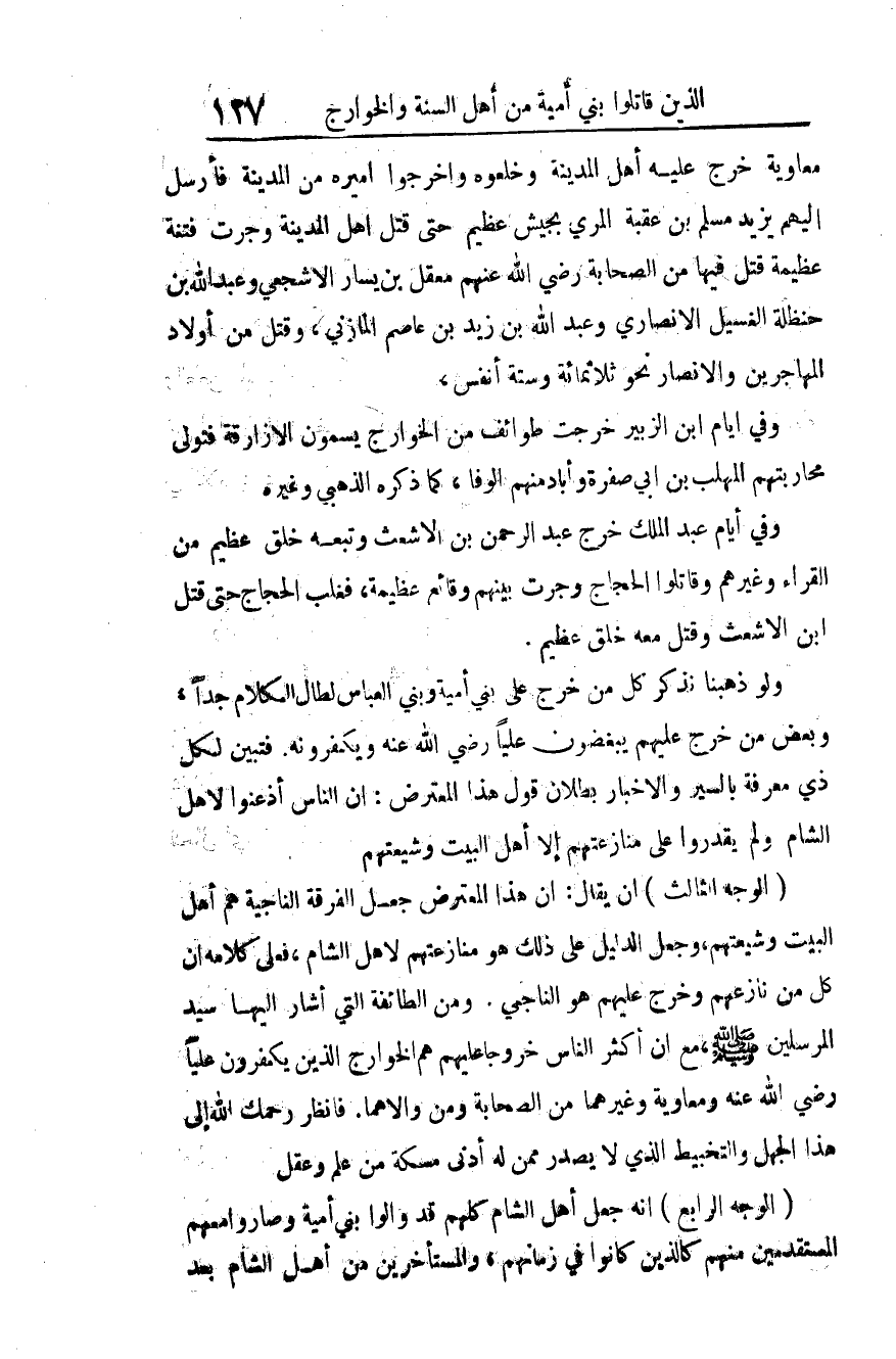 ولو ذهبنا نذكر كل من خرج على بني أمية وبني العباس لطال الكلام جدا، وبعض من خرج عليهم يبغضون عليا رضي الله عنه ويكفرونه، فتبين لكل ذي معرفة بالسير والأخبار بطلان قول هذا المعترض: "أن الناس أذعنوا لأهل الشام ولم يقدروا على منازعتهم إلا أهل البيت وشيعتهم".