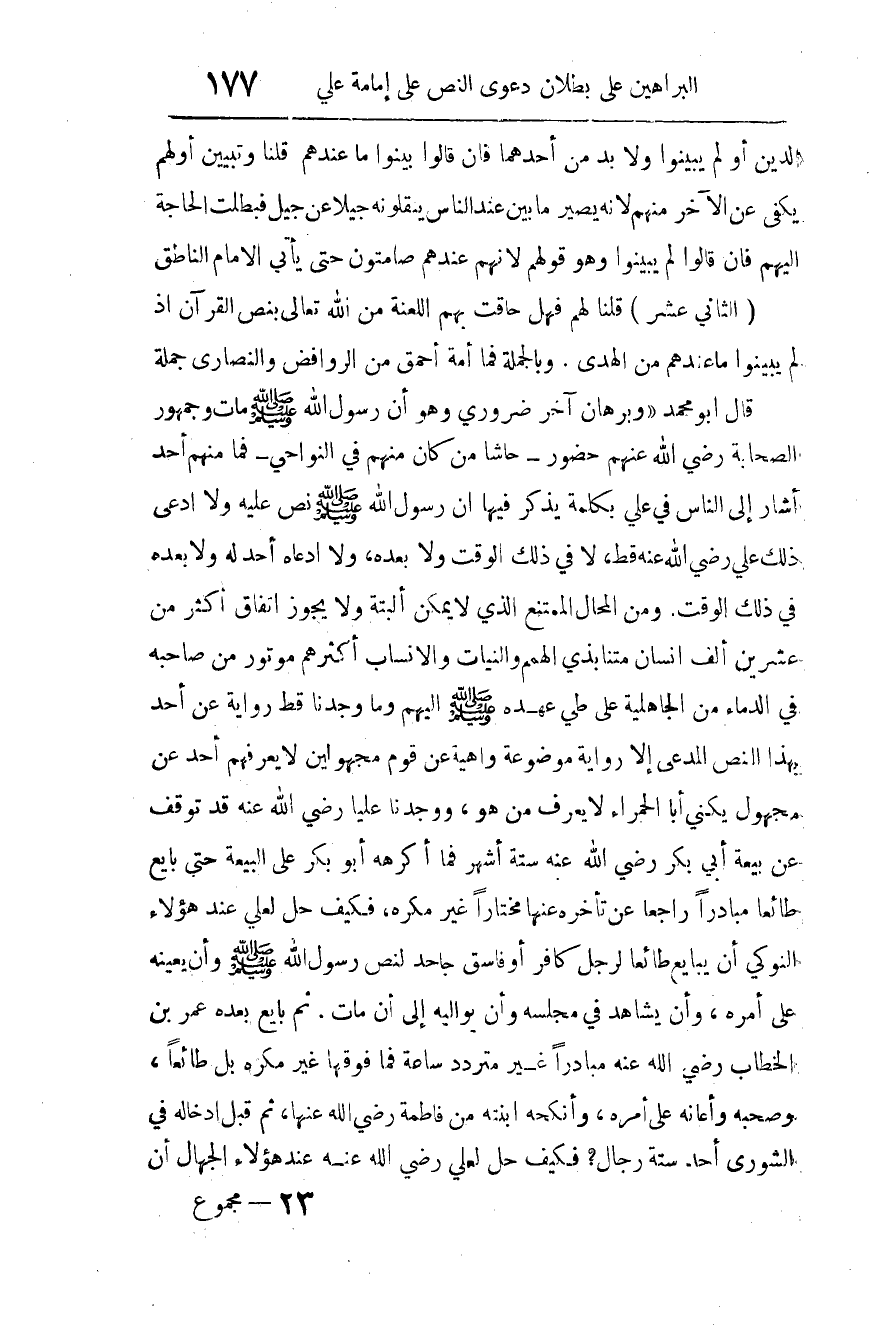 الدين أو لم يبينوا؟ ولا بد من أحدهما، فإن قالوا: بينوا ما عندهم. قلنا: وتبيين أولهم يكفي عن الآخر منهم؛ لأنه يصير ما بين عند الناس ينقلونه جيلا عن جيل، فبطلت الحاجة إليهم. فإن قالوا: لم يبينوا –وهو قولهم- لأنهم عندهم صامتون حتى يأتي الإمام الناطق (الثاني عشر) .