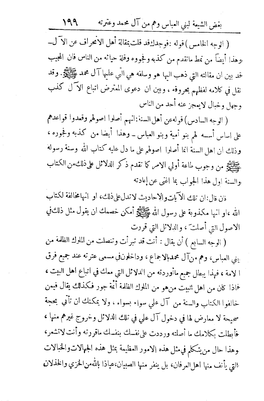 (الوجه السابع) : أن يقال: أنت قد تبرأت وتنصلت من الملوك الظلمة من بني العباس، وهم من آل محمد بالإجماع، وداخلون في مسمى عترته عند جميع فرق الأمة، فهذا يبطل جميع ما أوردته من الدلائل التي معك في اتباع أهل البيت، فإذا كان من أهل البيت مَنْ هو من الملوك الظلمة أئمة جور.