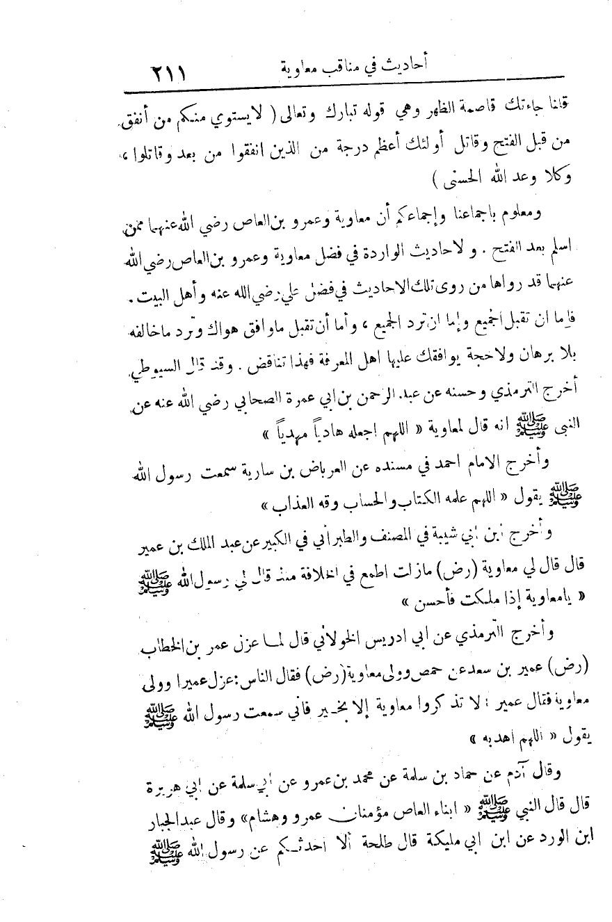 ومعلوم بإجماعنا وإجماعكم أن معاوية وعمرو بن العاص -رضي الله عنهما- ممن أسلم بعد الفتح، والأحاديث الواردة في فضل معاوية وعمرو بن العاص -رضي الله عنهما- قد رواها مَنْ روى تلك الأحاديث في فضل علي رضي الله عنه وأهل البيت، فإما أن تقبل الجميع، وإما أن ترد الجميع، وأما أن تقبل ما وافق هواك، وترد ما خالفه بلا برهان ولا حجة يوافقك عليها أهل المعرفة، فهذا تناقض، وقد قال السيوطي: أخرج الترمذي وحسَّنه عن عبد الرحمن بن أبي عمرة الصحابي رضي الله عنه عن النبي صلى الله عليه وسلم أنه قال لمعاوية: "اللهم اجعله هاديا مهديا" 2.