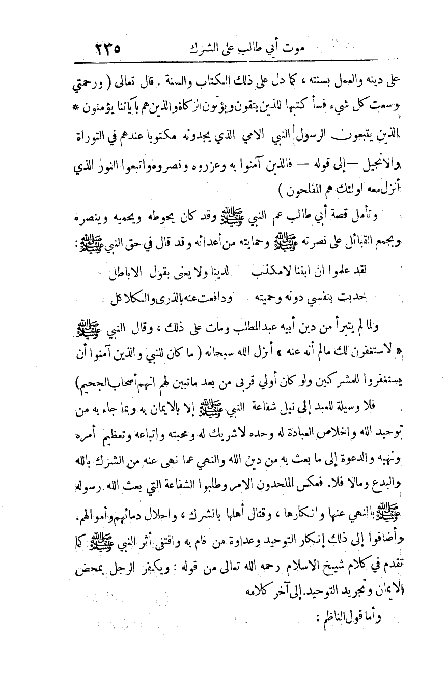 ولما لم يتبرأ من دين أبيه عبد المطلب، ومات على ذلك، وقال النبي صلى الله عليه وسلم "لأستغفرن لك ما لم أُنْهَ عنه" 3 أنزل الله –سبحانه-: {مَا كَانَ لِلنَّبِيِّ وَالَّذِينَ آمَنُوا أَنْ يَسْتَغْفِرُوا لِلْمُشْرِكِينَ وَلَوْ كَانُوا أُولِي قُرْبَى مِنْ بَعْدِ مَا تَبَيَّنَ لَهُمْ أَنَّهُمْ أَصْحَابُ الْجَحِيمِ} 4.