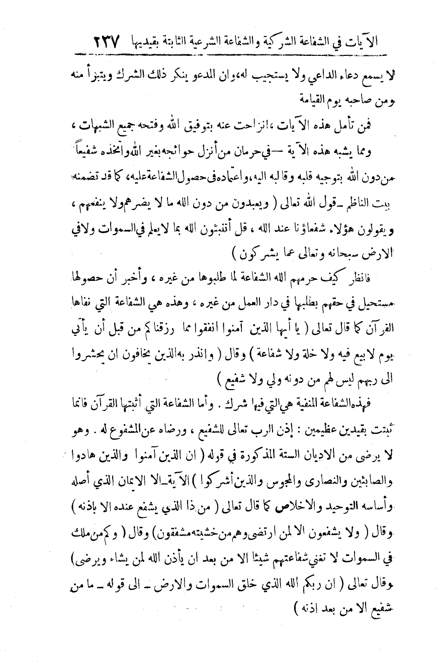 فهذه الشفاعة المنفية هي التي فيها شرك، وأما الشفاعة التي أثبتها القرآن فإنما ثبتت بقيدين عظيمين: إذن الرب تعالى للشفيع، ورضاه عن المشفوع له، وهو لا يرضى من الأديان الستة المذكورة في قوله: {إِنَّ الَّذِينَ آمَنُوا وَالَّذِينَ هَادُوا وَالصَّابِئِينَ وَالنَّصَارَى وَالْمَجُوسَ وَالَّذِينَ أَشْرَكُوا} 4 الآية، إلا الإيمان الذي أصله وأساسه التوحيد والإخلاص، كما قال تعالى: {مَنْ ذَا الَّذِي يَشْفَعُ عِنْدَهُ إِلاَّ بِإِذْنِهِ} 5، وقال: {وَلا يَشْفَعُونَ إِلاَّ لِمَنِ ارْتَضَى وَهُمْ مِنْ خَشْيَتِهِ مُشْفِقُونَ} 6، وقال: {وَكَمْ مِنْ مَلَكٍ فِي السَّمَاوَاتِ لا تُغْنِي شَفَاعَتُهُمْ شَيْئاً إِلاَّ مِنْ بَعْدِ أَنْ يَأْذَنَ اللَّهُ لِمَنْ يَشَاءُ وَيَرْضَى} 7، وقال تعالى: {إِنَّ رَبَّكُمُ اللَّهُ الَّذِي خَلَقَ السَّمَاوَاتِ وَالْأَرْضَ} 8 إلى قوله: {مَا مِنْ شَفِيعٍ إِلاَّ مِنْ بَعْدِ إِذْنِهِ} 9.