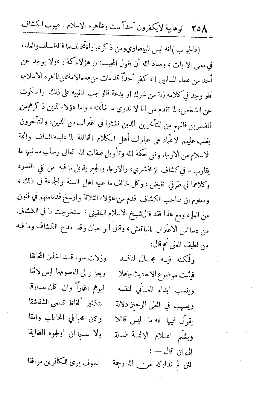(فالجواب) : أنه ليس للبيضاوي، ومن ذكر، عبارةٌ تخالف ما قاله السلف والعلماء في معنى الآيات، ومعاذ الله أن يقول المجيب: إن هؤلاء كفار، ولا يوجد عن أحد من علماء المسلمين أنه كَفَّرَ أحدًا قد مات من هذه الأمة ممن ظاهره الإسلام، فلو وجد في كلامه زلة من شرك أو بدعة، فالواجب التنبيه على ذلك والسكوت عن الشخص؛ لما تقدم من أنا لا ندري ما خاتمته. وأما هؤلاء الذين ذكرهم من المفسرين فإنهم من المتأخرين الذين نشؤوا في اغتراب من الدين.