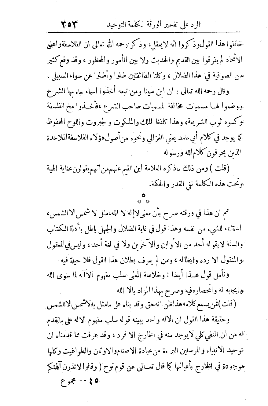 ثم إن هذا في ورقته صرح بأن معنى "لا إله إلا الله" مثل: "لا شمس إلا الشمس" استثناء للشيء من نفسه، وهذا قول في غاية الضلال والجهل، باطل بأدلة الكتاب والسنة، لا يقوله أحد من الأولين والآخرين، ولا في لغة أحد، وليس في المعقول والمنقول إلا رده وإبطاله، ومن لم يعرف بطلان هذا القول فلا حيلة فيه.