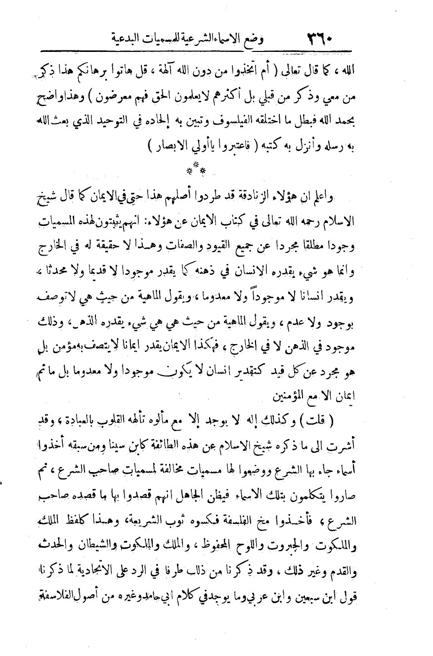 الله"، كما قال -تعالى-: {أَمِ اتَّخَذُوا مِنْ دُونِهِ آلِهَةً قُلْ هَاتُوا بُرْهَانَكُمْ هَذَا ذِكْرُ مَنْ مَعِيَ وَذِكْرُ مَنْ قَبْلِي بَلْ أَكْثَرُهُمْ لا يَعْلَمُونَ الْحَقَّ فَهُمْ مُعْرِضُونَ} 1، وهذا واضح بحمد الله، فبطل ما اختلقه الفيلسوف، وتبين به إلحاده في التوحيد الذي بعث الله به رسله، وأنزل به كتبه {فَاعْتَبِرُوا يَا أُولِي الأَبْصَارِ} 2.