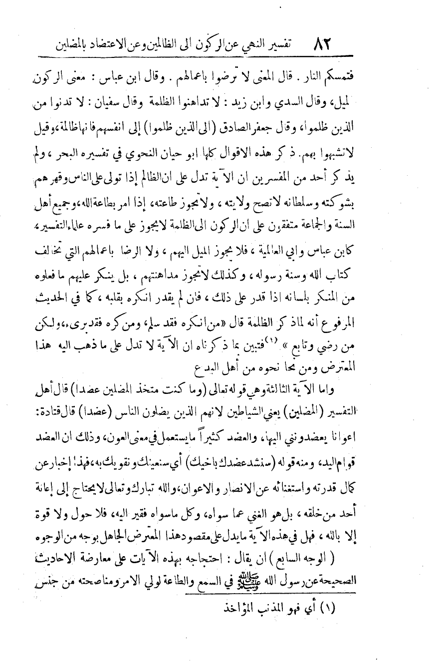 وجميع أهل السنة والجماعة متفقون على أن الركون إلى الظلمة لا يجوز على ما فسره علماء التفسير، كابن عباس، وأبي العالمية، فلا يجوز الميل إليهم، ولا الرضى بأعمالهم التي تخالف كتاب الله وسنة رسوله. وكذلك لا تجوز مداهنتهم، بل ينكر عليهم ما فعلوه من المنكر بلسانه إذا قدر على ذلك، فإن لم يقدر أنكره بقلبه، كما في الحديث المرفوع أنه لما ذكر الظلمة قال: " من أنكره فقد سلم، ومن كره فقد برئ، ولكن من رضي وتابع" 2 3. فتبين بما ذكرناه أن الآية لا تدل على ما ذهب إليه هذا المعترض، ومن نحا نحوه من أهل البدع.