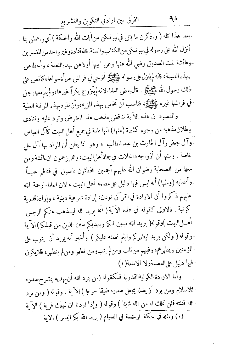 (ومنها) : أنه ليس فيها دليل على عصمة أهل البيت؛ لأن العلماء -رحمة الله عليهم- ذكروا أن الإرادة في القرآن نوعان: إرادة شرعية دينية، وإرادة قدرية كونية؛ فالأولى كقوله في هذه الآية: {إِنَّمَا يُرِيدُ اللَّهُ لِيُذْهِبَ عَنْكُمُ الرِّجْسَ أَهْلَ الْبَيْتِ} 2 وقوله: {يُرِيدُ اللَّهُ لِيُبَيِّنَ لَكُمْ وَيَهْدِيَكُمْ سُنَنَ الَّذِينَ مِنْ قَبْلِكُمْ} 3 الآية وقوله: {وَلَكِنْ يُرِيدُ لِيُطَهِّرَكُمْ وَلِيُتِمَّ نِعْمَتَهُ عَلَيْكُمْ} 4. وأخبر أنه يريد أن يتوب على المؤمنين ويطهرهم، وفيهم من تاب ومن لم يتب، ومن تطهر ومن لم يتطهر، فلا يكون فيها دليل على العصمة، ولا الإمامة. 5
