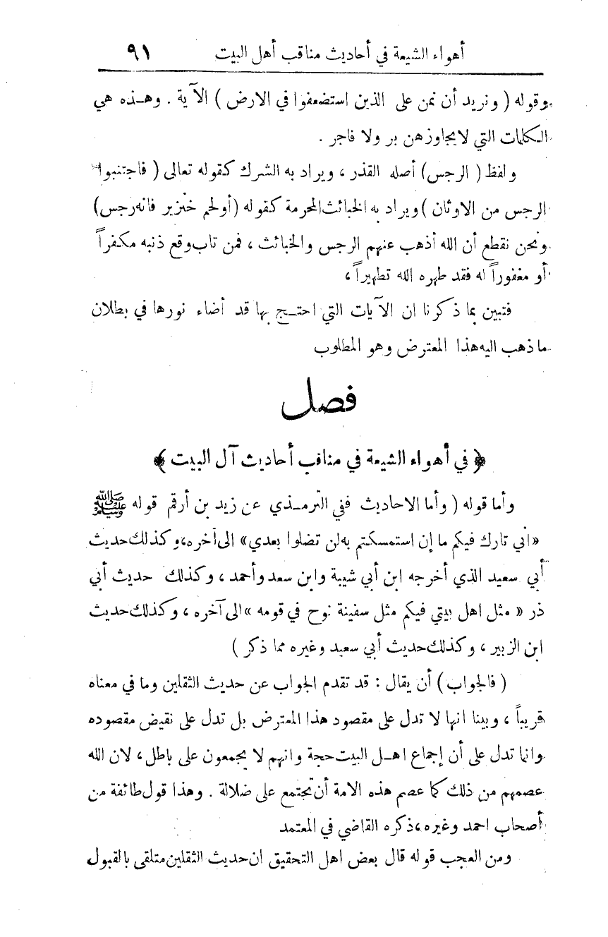 وأما قوله: (وأما الأحاديث ففي الترمذي عن زيد بن أرقم قوله صلى الله عليه وسلم: "إني تارك فيكم ما إن استمسكتم به لن تضلوا بعدي" 1 إلى آخره، وكذلك حديث أبي سعيد الذي أخرجه ابن أبي شيبة، وابن سعد وأحمد، وكذلك حديث أبي ذر: "مثل أهل بيتي فيكم مثل سفينة نوح في قومه" إلى آخره، وكذلك حديث ابن الزبير، وكذلك حديث أبي سعيد وغيره مما ذكر) .