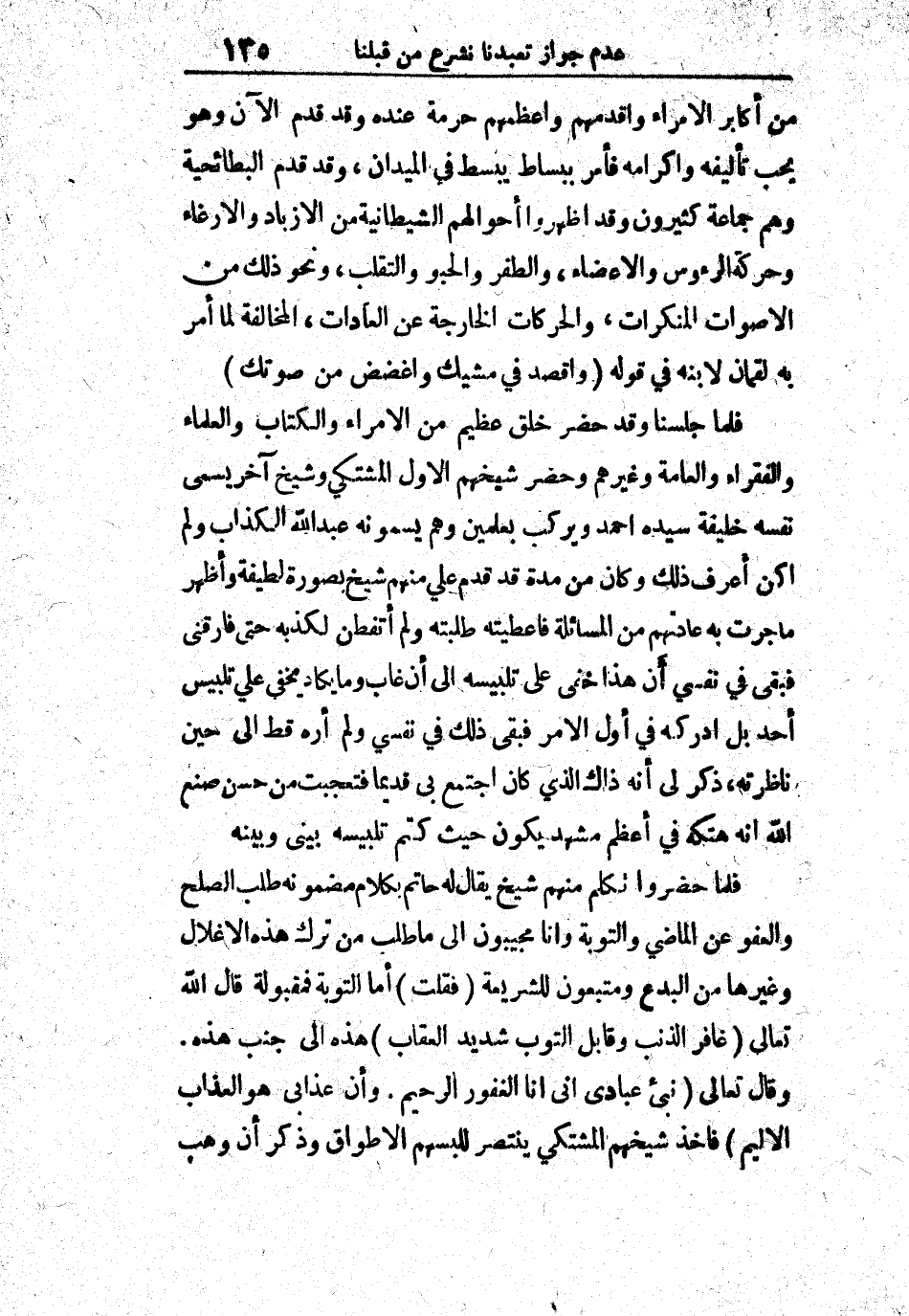 من أكابر الأمراء وأقدمهم وأعظمهم حرمة عنده وقد قدم الآن وهو يحب تأليفه وإكرامه فأمر ببساط يبسط في الميدان، وقد قدم البطائحية وهم جماعة كثيرون وقد أظهروا أحوالهم الشيطانية من الإزباد والإرغاء وحركة الرؤوس والأعضاء والطفر والحبو والتقلب، ونحو ذلك من الأصوات المنكرات، والحركات الخارجة عن العادات، المخالفة لما أمر به لقمان لابنه في قوله: " واقصد في مشيك واغضض من صوتك " فلما جلسنا وقد حضر خلق عظيم من الأمراء والكتاب والعلماء والفقراء والعامة وغيرهم وحضر شيخهم الأول المشتكي وشيخ آخر يسمى نفسه خليفة سيده أحمد ويركب بعلمين وهم يسمونه عبد الله الكذاب ولم أكن أعرف ذلك وكان من مدة قد قدم علي منهم شيخ بصورة لطيفة وأظهر ما جرت به عادتهم من المسائلة فأعطيته طلبته ولم أتفطن لكذبه حتى فارقني فبقي في نفسي أن هذا خفي على تلبيسه إلى أن غاب وما يكاد يخفى علي تلبيس أحد بل أدركه في أول الأمر فبقي ذلك في نفسي ولم أره قط إلى حين ناظرته، ذكر لي أنه ذاك كان اجتمع بي قديماً فتعجبت من حسن صنع الله أنه هتكه في أعظم مشهد يكون حيث كتم تلبيسه بيني وبينه، فلما حضروا تكلم منهم شيخ يقال له حاتم بكلام مضمون طلب الصلح والعفو عن الماضي والتوبة وإنا مجيبون إلى ما طلب من ترك هذه الأغلال وغيرها من البدع ومتبعون للشريعة فقلت: أما التوبة فمقبولة قال الله تعالى: " غافر الذنب وقابل التوب شديد العقاب " هذه إلى جنب هذه، وقال تعالى: " نبئ عبادي إني أنا الغفور الرحيم، وأن عذابي هو العذاب الأليم " فأخذ شيخهم المشتكي ينتصر للبسهم الأطواق وذكر أن وهب