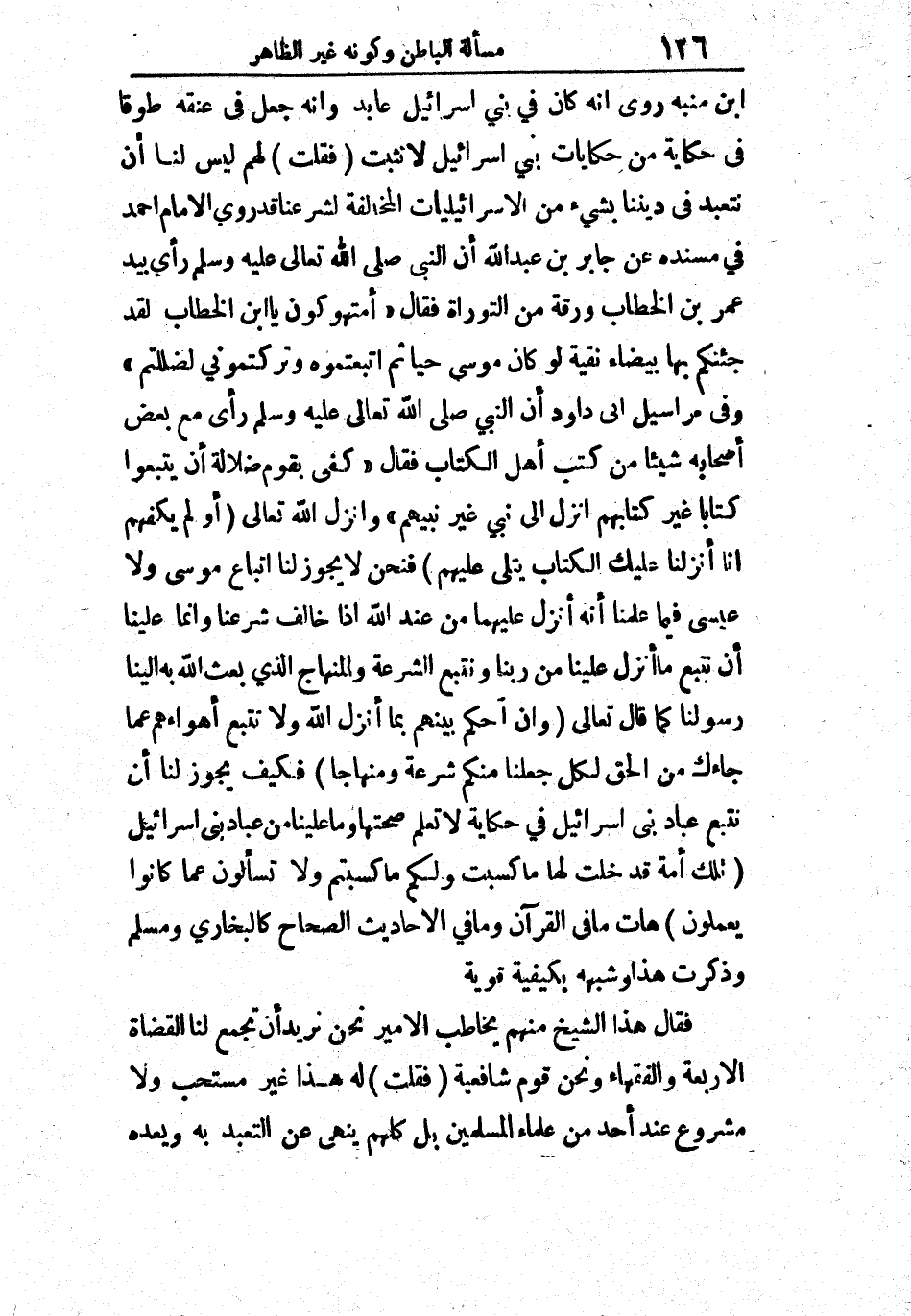 ابن منبه أنه كان في بني إسرائيل عابد وأنه جعله في عنقه طوقاً في حكاية من حكايات بين إسرائيل لا تثبت، فقلت: لهم ليس لنا أن نتعبد في ديننا بشيء من الإسرائيليات المخالفة لشرعنا قد روى الإمام أحمد في مسنده عن جابر بن عبد الله أن النبي صلى الله تعالى عليه وسلم رأى بيد عمر بن الخطاب ورقة من التوراة فقال: " أمتهوكون يا ابن الخطاب لقد جئتكم بها بيضاء نقية لو كان موسى حياً ثم اتبعتموه وتركتموني لضللتم ".