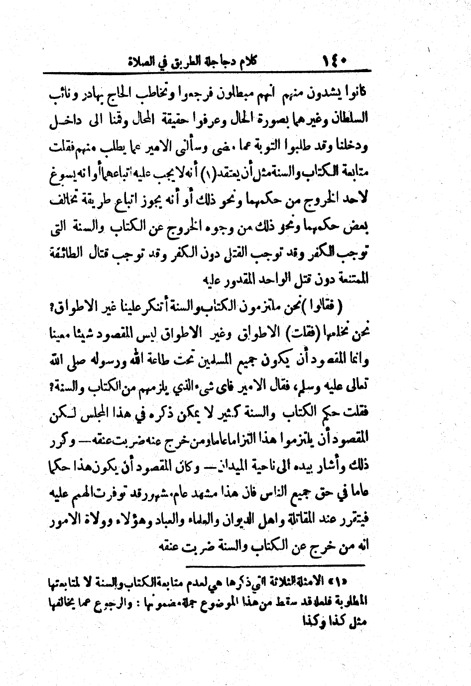 فقالوا: نحن ملتزمون الكتاب والسنة أتنكر علينا غير الأطواق، نحن نخلعها. فقلت: الأطواق وغير الأطواق ليس المقصود شيئاً معيناً وإنما المقصود أن يكون جميع المسلمين تحت طاعة الله ورسوله صلى تعالى الله عليه وسلم، فقال الأمير: فأي شيء الذي يلزمهم من الكتاب والسنة؟ فقلت: حكم الكتاب والسنة كثير لا يمكن ذكره في هذا المجلس لكن المقصود أن يلتزموا هذا التزاماً عاماً ومن خرج عنه ضربت عنقه - وكرر ذلك وأشار بيده إلى ناحية الميدان - وكان المقصود أن يكون هذا حكماً عاماً في حق جميع الناس فإن هذا مشهد عام مشهور وقد توفرت الهمم عليه فيتقرر عند المقاتلة وأهل الديوان والعلماء والعباد وهؤلاء وولاة الأمور أنه من خرج عن الكتاب والسنة ضربت عنقه.