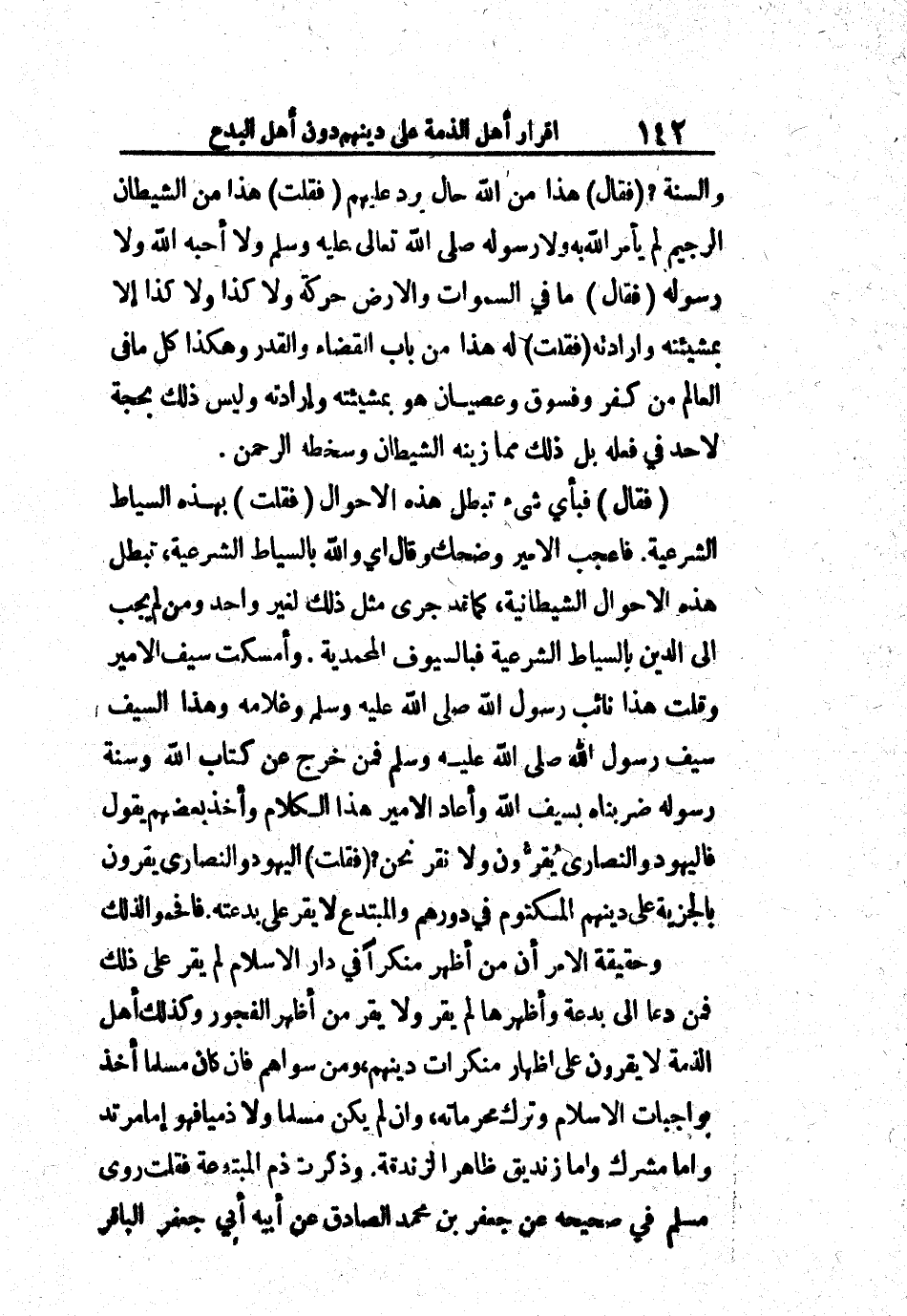 (فقلت) اليهود والنصارى يقرون بالجزية على دينهم المكتوم في دورهم والمبتدع لا يقر على بدعته فافحموا لذلك وحقيقة الأمر أن من أظهر منكراً في دار الإسلام لم يقر على ذلك فمن دعا إلى بدعة وأظهرها لم يقر ولا يقر من أظهر الفجور وكذلك أهل الذمة لا يقرون على إظهار منكرات دينهم، ومن سواهم فإن كان مسلماً أخذ بواجبات الإسلام وترك محرماته، وإن لم يكن مسلماً ولا ذميا فهو إما مرتد وإما مشرك وإما زنديق ظاهر الزندقة وذكرت ذم المبتدعة فقلت روى مسلم في صحيحه عن جعفر بن محمد الصادق عن أبيه أبي جعفر الباقر