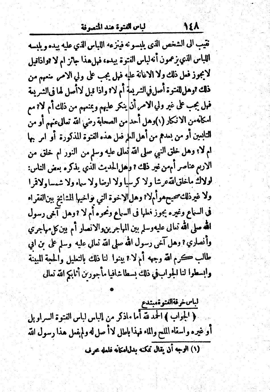 نقيب إلى الشخص الذي يلبسونه فينزعه اللباس الذي عليه بيده ويلبسه اللباس الذي يزعمون أنه لباس الفتوة بيده، فهل هذا جائز أم لا؟ وإذا قيل لا يجوز فعل ذلك ولا الإعانة عليه فهل يجب على ولي الأمر منعهم من ذلك؟ وهل للفتوة أصل في الشريعة أم لا؟ وإذا قيل: لا أصل لها في الشريعة فهل يجب على غير ولي الأمر أن ينكر عليهم ويمنعهم من ذلك أم لا؟ مع إمكانه من الإنكار (1) وهل أحد من الصحابة رضي الله تعالى عنه أو من التابعين أو من بعدهم من أهل العلم فعل هذه الفتوة المذكورة أو أمر بها أم لا؟ وهل خلق النبي صلى الله تعالى عليه وسلم من النور أم خلق من الأربع عناصر أم من غير ذلك؟ وهل الحديث الذي يذكره بعض الناس لولاك ما خلق الله عرشاً ولا كرسياً ولا أرضاً ولا سماءً ولا شمساً ولا قمراً ولا غير ذلك صحيح هو أم لا؟ وهل الأخوة التي يؤاخيها المشايخ بين الفقراء في السماع وغيره يجوز فعلها في السماع ونحوه أم لا؟ وهل آخى رسول الله صلى الله تعالى عليه وسلم بين المهاجرين والأنصار أم بين كل مهاجري وأنصاري؟ وهل آخى رسول الله صلى الله تعالى عليه وسلم علي بن أبي طالب كرم الله وجهه أم لا؟ بينوا لنا ذلك بالتعليل والحجة المبينة وابسطوا لنا الجواب في ذلك بسطاً شافياً مأجورين أثابكم الله تعالى.
